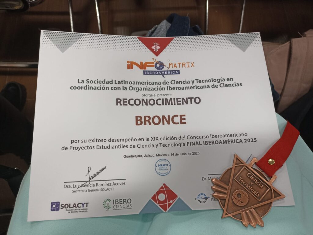 Guanajuato, Gto., a 20 de junio de 2025.- Las estudiantes Isabel Guadalupe Mendoza Reyes, María Fernanda Ramírez Macías y Cynthia Jannet Killian Gallardo quienes cursan la Licenciatura en Químico Farmacéutico Biólogo de la Universidad de Guanajuato (UG), ganaron la medalla de bronce en la categoría “INFOMATRIX” del XIX Concurso Iberoamericano de Proyectos Estudiantiles de Ciencia y Tecnología.