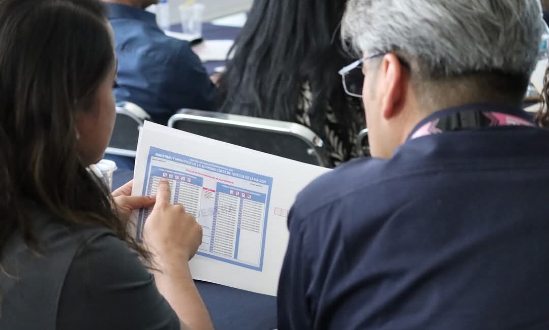 Añadió que cada boleta considera los siguientes elementos: nombre del proceso electoral, nombre de la elección, entidad federativa, distrito electoral, circunscripción plurinominal o circuito judicial y distrito judicial, según corresponda, especialidad por materia a la que se postula cada persona candidata, en su caso y los nombres de las personas candidatas presentados en dos listados (mujeres y hombres) con un número identificador y distribuidos por orden alfabético y progresivo, distinguiendo la autoridad postulante y las candidaturas de las personas juzgadoras que estén en funciones en los cargos a renovar.