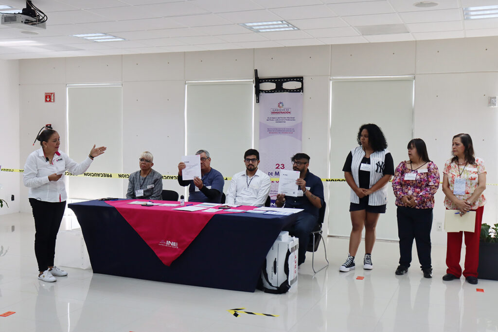 Esta demostración estuvo a cargo de Cecilia Maldonado Reyes y Mario Barbosa Ortega, Vocales de Capacitación Electoral y Educación Cívica, y de Organización Electoral, respectivamente.