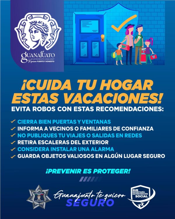 Guanajuato., 17 de abril del 2025.- La Secretaría de Seguridad Ciudadana de Guanajuato capital recomienda tomar en cuenta las recomendaciones para prevenir robos en viviendas. Debido a que un gran número de personas salen de vacaciones durante el periodo de Semana Santa, es necesario la mantener las medidas de prevención...